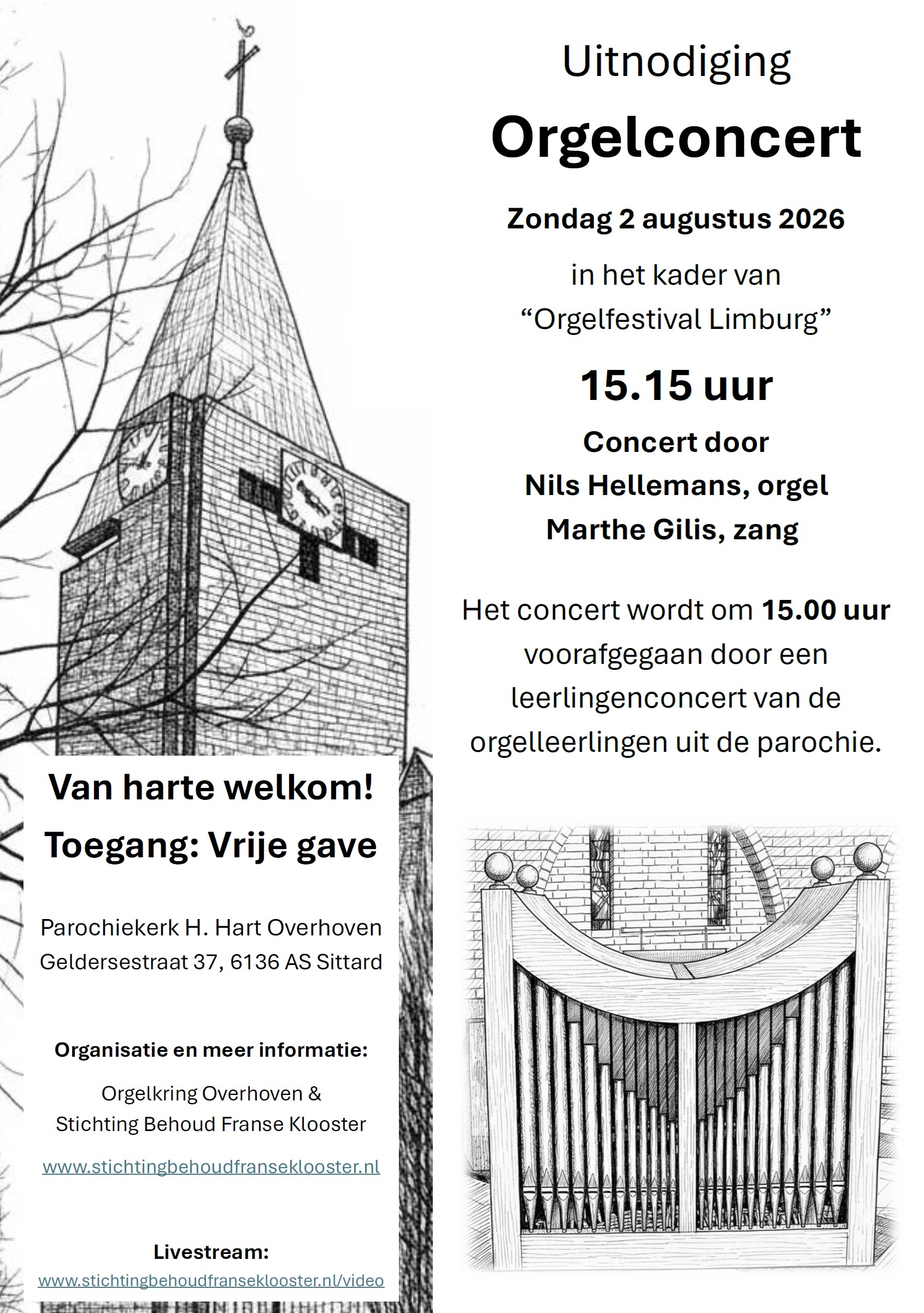 In het kader van ‘Orgelfestival Limburg’ wordt er op zondagmiddag 2 augustus 2026 om 15.15 uur een orgelconcert gegeven in de Parochiekerk H. Hart Overhoven, Geldersestraat 37, 6136 AS Sittard.