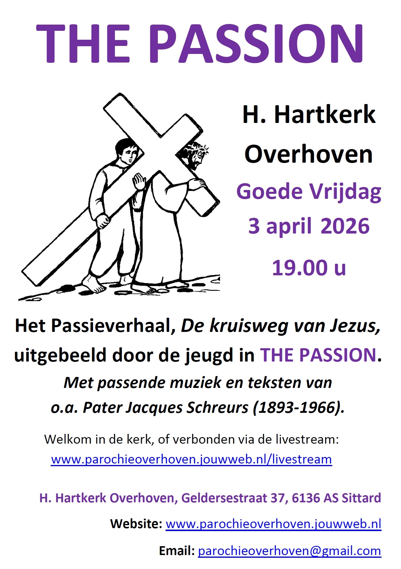 THE PASSION in de H. Hartkerk te Overhoven-Sittard op Goede Vrijdag, 3 april 2026 om 19.00 uur met uitbeelding, muziek en teksten van o.a. Pater Jacques Schreurs (1893-1966) door de jeugd en jongeren.